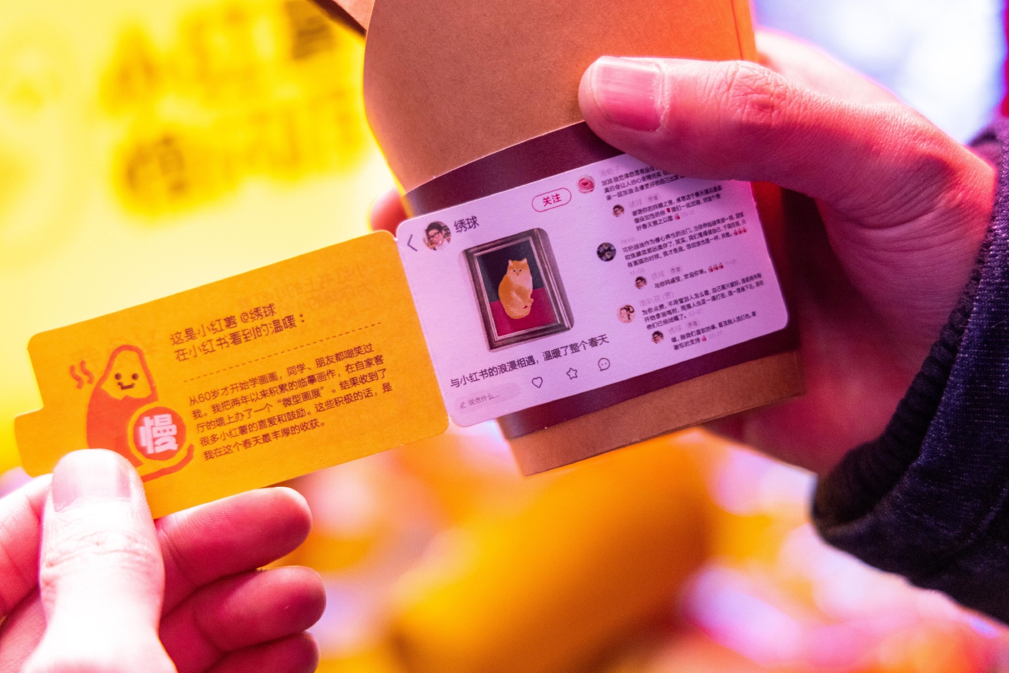 今年在更多城市开张的「小红薯慢闪店」中,每一款烤红薯的包装上都写着「一颗薯,两份暖」。第一份暖指的是手里这颗烤发出热气的红薯,而第二份就是小红书用户在小红书社区内发现的温暖内容和用户之间的温暖互动。