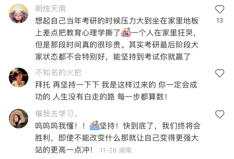在前一段过去的考研备考时期,用户@不做摆烂修勾 发布了一条笔记,说自己复习压力大到崩溃,经常背着背着书就哭了。但是在她评论区的小红薯们,一直在给她留言鼓励,给了她坚持下去的力量。