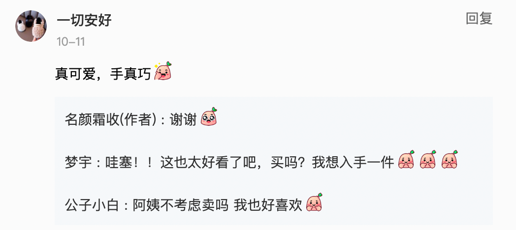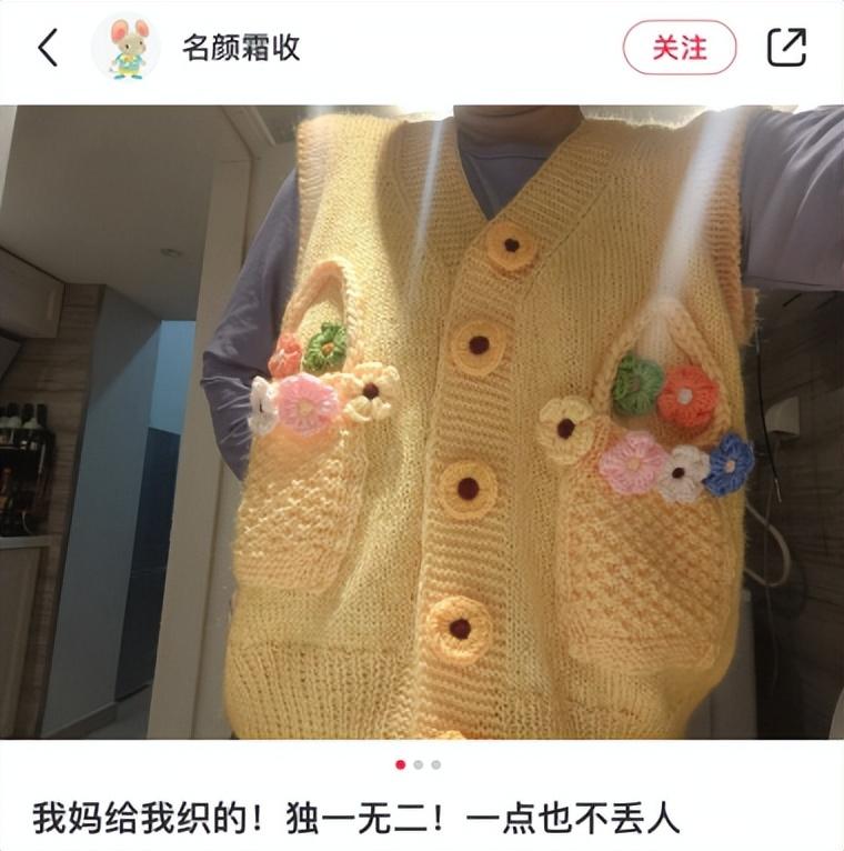 小红书用户@名颜霜收 分享了妈妈给自己织的毛衣,说自己的妈妈总怕她嫌穿出去丢人,但她觉得妈妈织的毛衣是独一无二的,自己特别喜欢。在评论区里,也有其他「小红薯」们表示了肯定,认为毛衣可爱,并夸赞了她妈妈手巧,这也让他很开心。